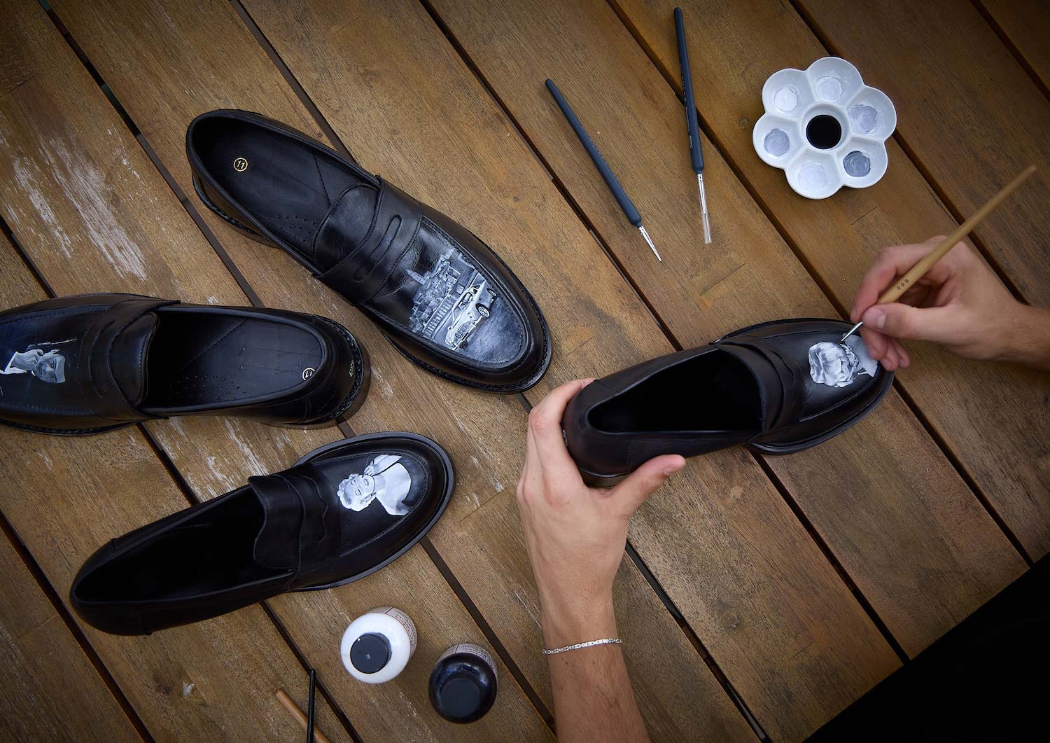 So I started experimenting from my university bedroom, researching materials and painting my own trainers. Through that process, I learned how well leather works with specialist paints and gradually refined techniques that could be applied across different styles of footwear, including dress shoes.