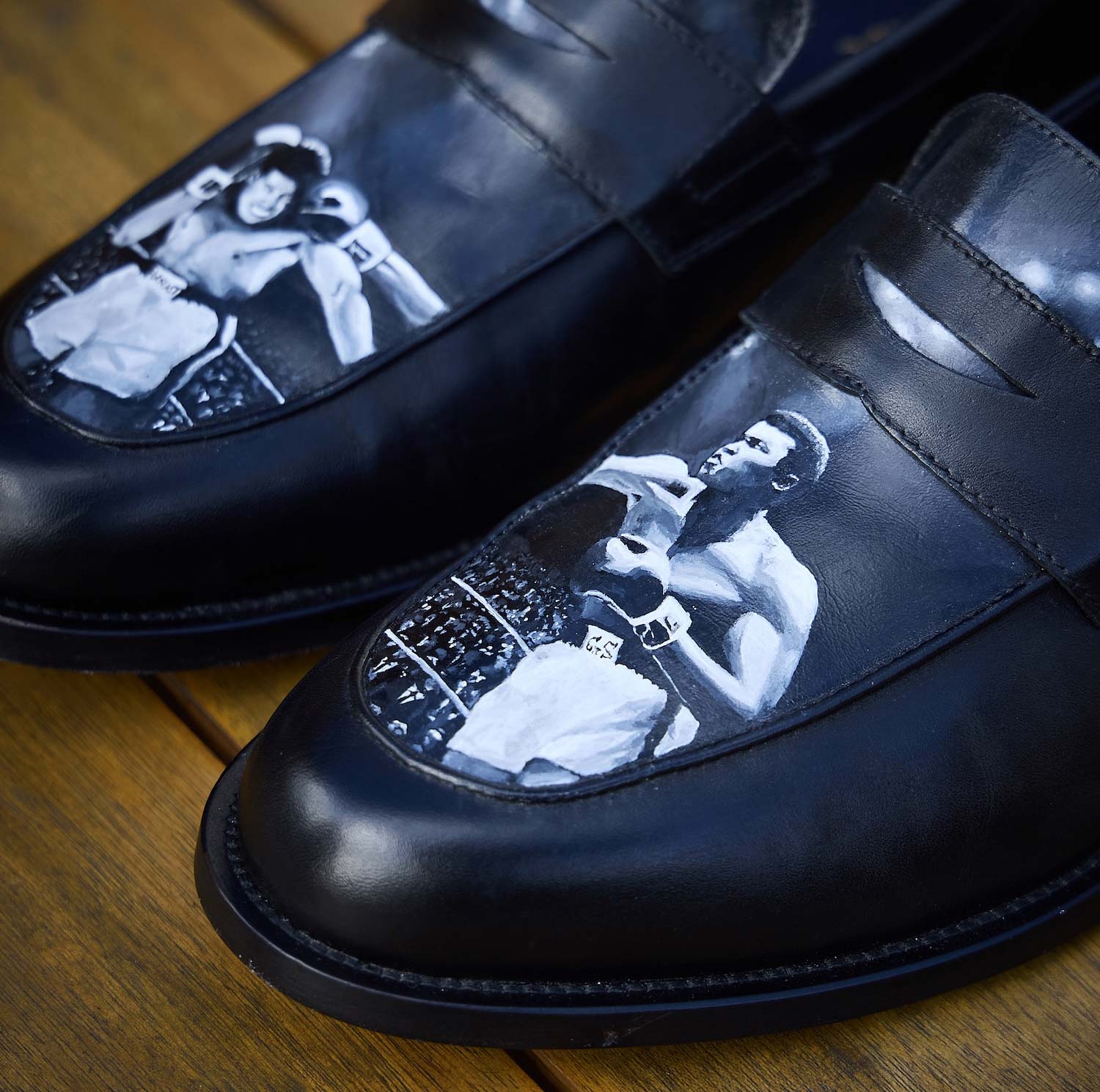 As a sports fan, some of my favourite commissions have been inspired by iconic sporting moments. One that stands out was painting Muhammad Ali during the famous 1974 ‘Rumble in the Jungle’. The design connected both shoes with an Ali knockout punch travelling across the pair.